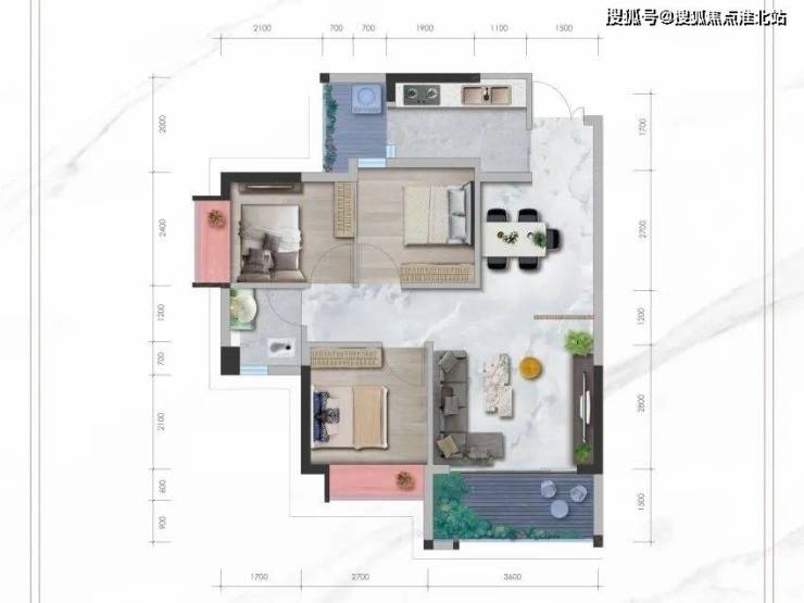 对比73㎡户型,90㎡三房更显宽阔一些,三房两卫一厨设计;L型厨房带有生活阳台;客厅有约3.7m的景观阳台,通风采光不错;主卧为套房,配独立的卫浴,私密性更强;另外两间次卧有飘窗,空间感更强。