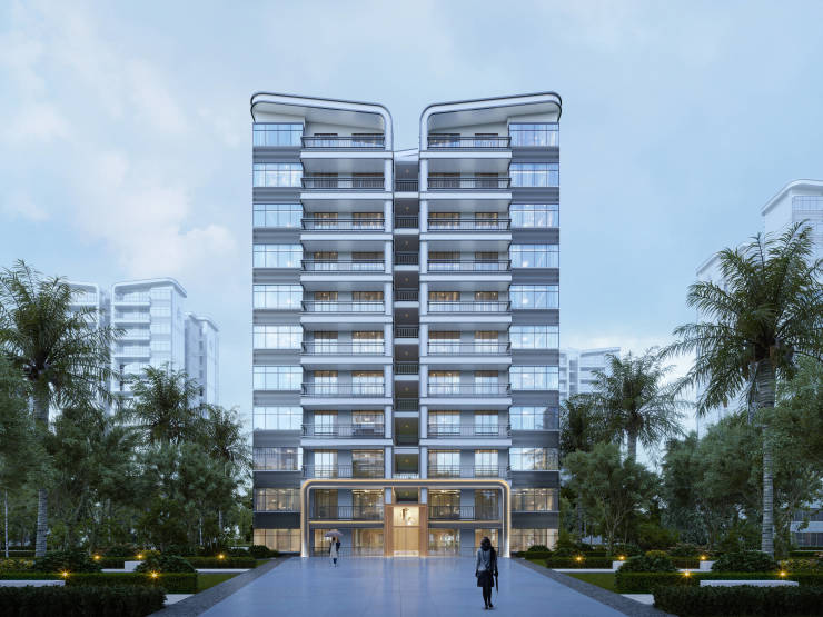 建筑风格:采用现代建筑风格,主题色调浅深搭配,简洁大方,屋顶采用圆角形式。整体墙面采用浅色调真石漆,搭配深灰色线条,局部门头采用金属色泽。