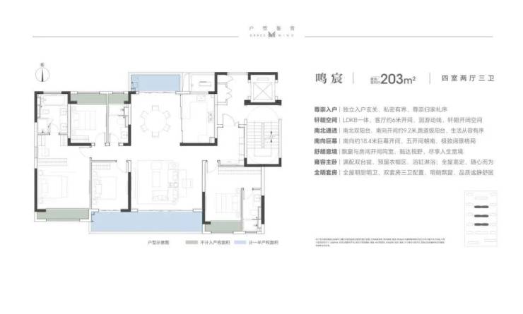如果可以增加一些预算,那么建面约203㎡的四室两厅三卫户型则无疑是更优选。它相当于在建面约170㎡户型的基础上做了结构上的伸展及调整。约9.2m超宽阳台、约18.4m南向巨幕面宽,阔境格局+双阳台设计,更大的空间感所带来的是实实在在的面子和气派。