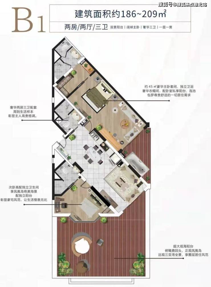 B1户型约186-209平方米 两房两厅三卫大阳台