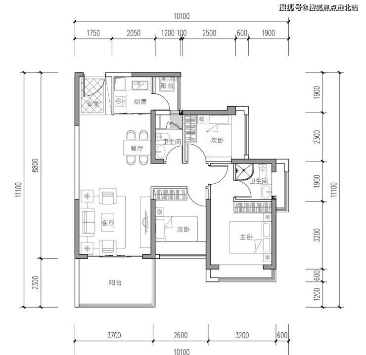 舒适三房,方正实用,两卫设计,正南户型,室室皆带飘窗,双阳台设计, 生活、景观明确分区,2.3m*3.7m宽阔阳台。