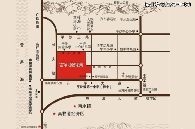 京华假日湾花园位于珠海平沙新城中心地段,总占地面积235534.8平方米,总建筑面积约50万平方米,是“温泉养生,度假之城”的超大型综合社区,建筑为简洁历练的南洋风格,景观以东南亚(巴厘岛景观元素为主)风格为主,整个社区处处洋溢着水系元素。同时为了更好的打造项目的度假概念,结合泰式的养生精神,在珠海首次引入“养生”的主题,丰富项目的建筑价值。项目的开建,将成为平沙首个国际度假综合城。