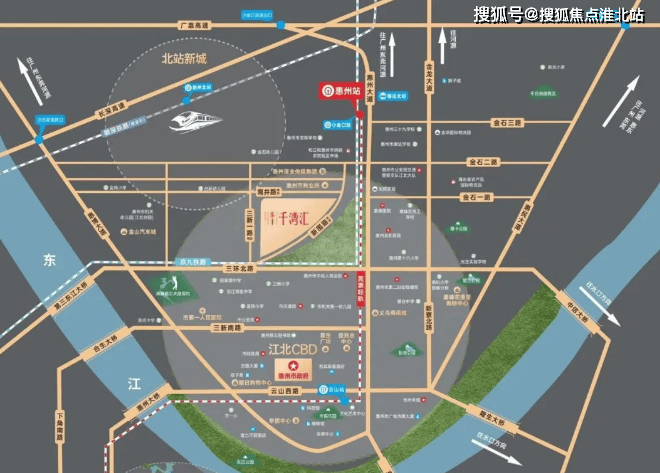 中心里:江北CBD之上,与惠州市政府,惠州商业地标——华贸中心,及惠州高铁北站呈直线型布局。