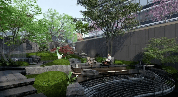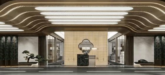 园林景观:示范区意取 “五泄叠瀑” 为造景灵感,打造一体化的自然界面,有立体山水景墙、全冠移植的树木、潺潺流水等景观,还有风雨休闲长廊,背景墙采用深灰色爱马仕灰石材,香槟金金属格栅的镂空图案是银杏叶的变形设计,既呼应西施故里的古树传说,又暗含 “家有长寿” 的美好寓意。