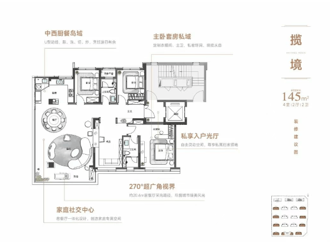 采用客餐厅一体化设计,打造家庭社交中心;设有中西厨餐岛域,U 型动线合理;主卧为套房设计,含定制衣帽间与主卫;还有私享入户光厅,空间自由灵动。拥有 270° 超广角视界,约 20.6m 客餐厅采光路径,采光、通风条件较好。