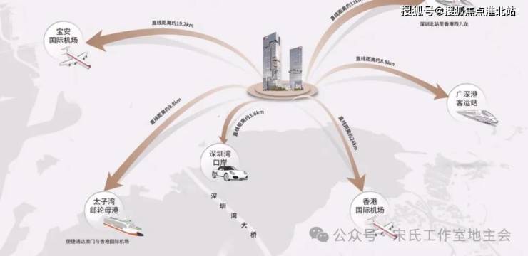 到达深圳机场约25km、到达深圳北站距离17km、到达深圳湾口岸距离6km、皇岗口岸距离约15km、到达蛇口码头距离约14km