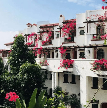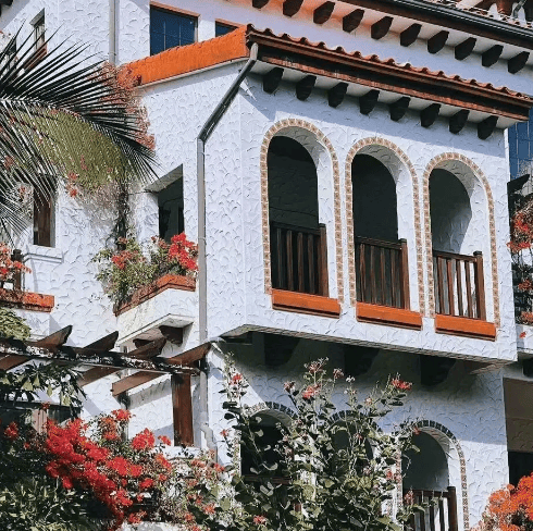 风情建筑:西班牙安达卢西亚风格,白墙红瓦、庭院泳池,颜值高