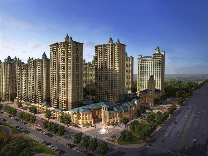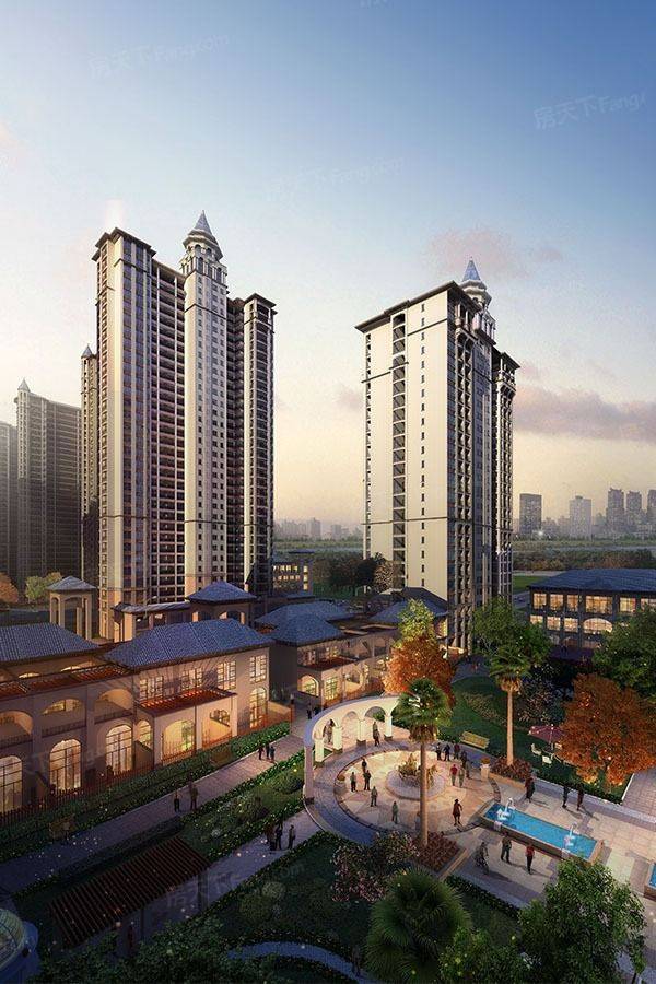 建筑形态:由 21 栋 24-32 层高层住宅及 5 万平米商业街组合而成,一期、二期以新西班牙式地中海风格为主。