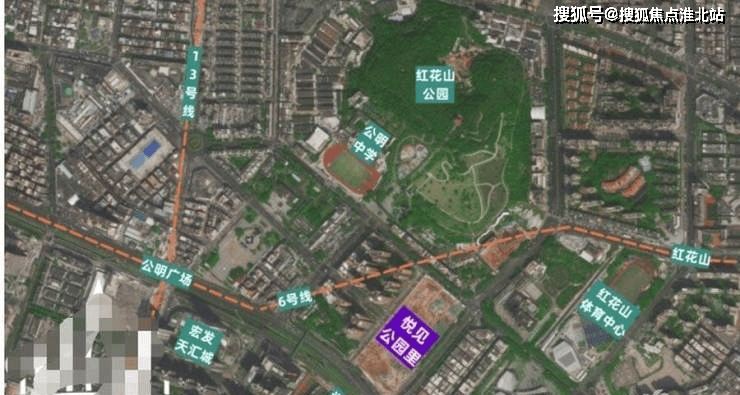 宏发悦见公园里位于光明区红花中路与松白路交叉路口,前身原为达叁旧改项目,就在总面积约27.39万㎡的红花山公园旁边。整体项目占地约3万㎡,总建面约33.8万㎡。
