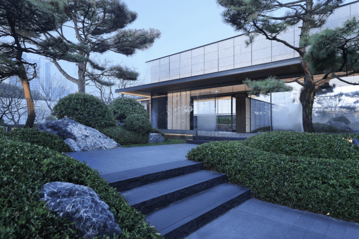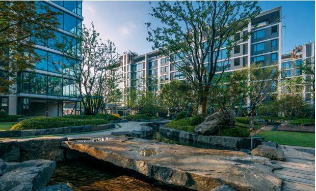 建筑与园林设计:以 “现代东方・静谧禅意” 为核心理念,融合良渚玉琮形制与当代设计,通过飞檐翘角、凝练线条等设计元素,展现当代东方建筑的独特魅力。小区内部园林景观以江南园林为蓝本,打造 “一园三堂” 的居住意境,并设有户外泳池、滨河营地、下沉式水榭等。