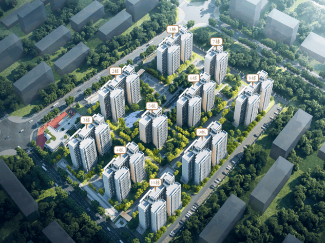 建筑构成:由 10 栋 14 层住宅楼、1 栋 3 层生鲜超市和 1 栋幼儿园组成,共 992 套安居房。