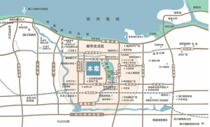 休闲:紧邻 1365 亩海秀公园,周边还有观海台、假日海滩、高尔夫球场、游艇会等休闲配套,以及秀英炮台、海瑞公祠等人文景点。