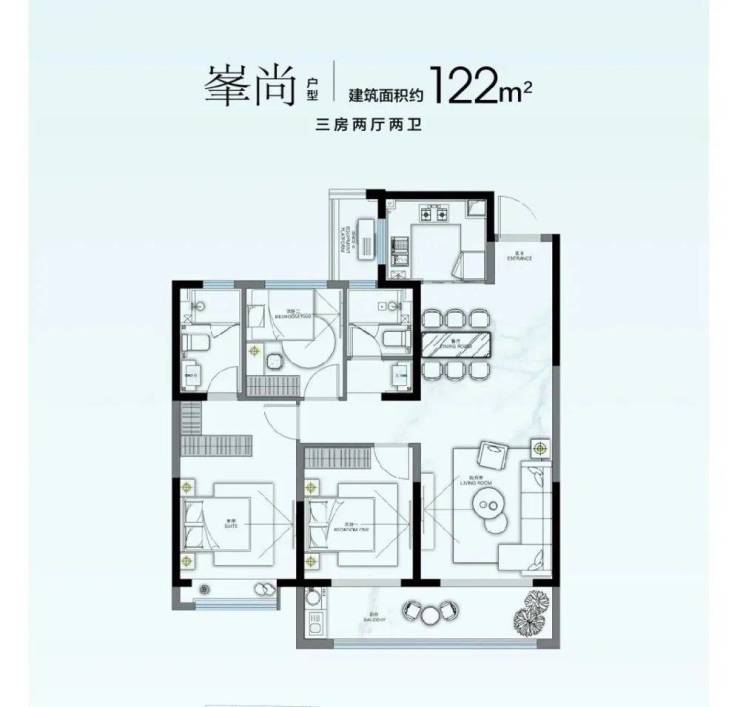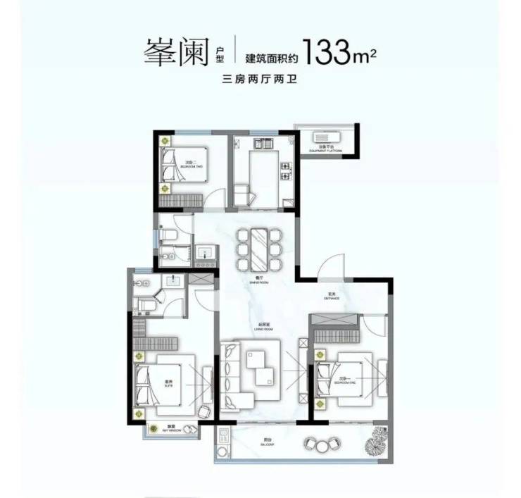 建面约122㎡和133㎡的两款户型都是三房两厅两卫的设计,不同的是133㎡用餐客一体的设计自然的分割了主卧和次卧,让每一位家庭成员都有自己的空间,不仅提升了生活的舒适性还节约了户内面积。