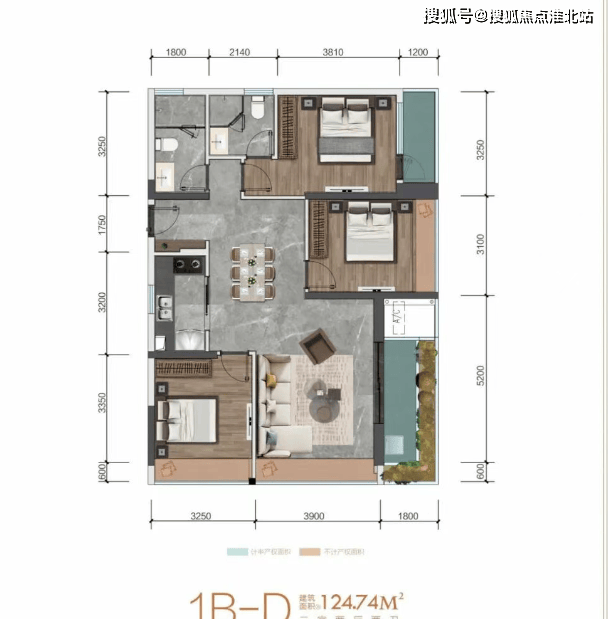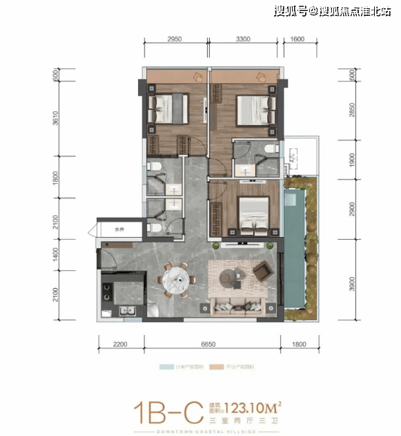 C 户型:建筑面积约 121㎡,三室两厅三卫。户型拥有正南向景观,南北通透,布局紧凑,厨房双灶台设计,客厅朝南外置约 10 米长的正南向阳台,可欣赏鹿回头公园景观,卧室均带落地窗,动静分离布局合理,内侧餐客生活区,外侧卧室区。