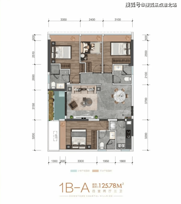A 户型:建筑面积约 126㎡,四室两厅三卫。奢雅全明户型,入户玄关处有鞋柜设计,客餐厅一体化,客厅连通超大观景阳台,L 型厨房双灶台设计,预留双开门冰箱位置,双主卧设置,主卧可观看白鹭公园及三亚湾海景,东向卧室可看山景及中庭景观。