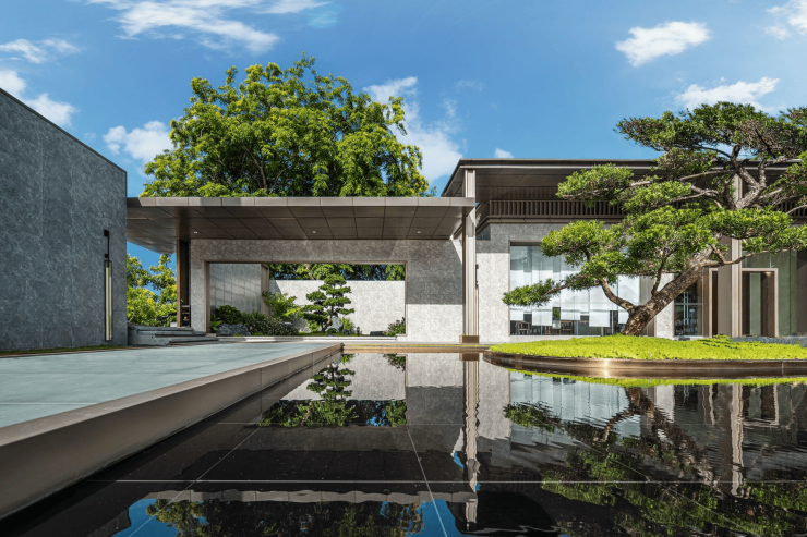 园林景观:由山水比德公司主笔设计,汲取新东方极简文化精华,打造私密围合 “大隐于市” 的生活场景。