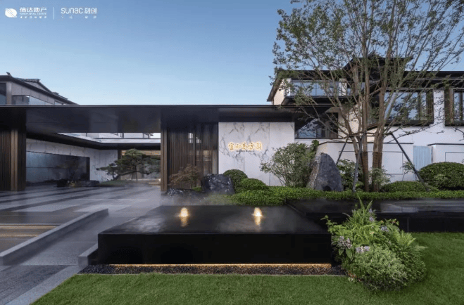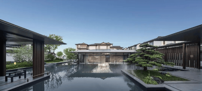 景观规划:中央景庭由合院区两大水院意趣相融而成,在低密住区中打造罕见的双中心水院,与晶莹剔透的现代玻璃建筑相映成趣,临水观照,逸趣自生。三进院落归家尊仪,一进长巷渐舒,层林浸染;二进松瀑石涧,四水归堂;三进纳湖入院,碧波粼粼,层层叠进彰显当代名门大家之仪。还有 “看松读画轩,月到风来亭” 等浮水为台、观水为亭、依山为榭的亭台水榭胜景,以碧波浸亭,陶公钓矶、颐乐茶室等写意当代东方的人文清雅 。