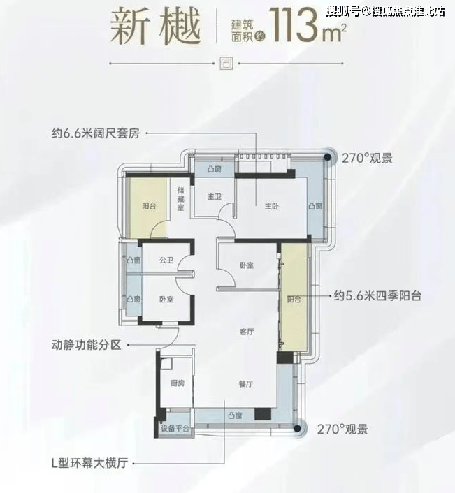113㎡的 4 房 2 厅 2 卫:横厅南北通透格局,进门有入户玄关。客餐厅一体化设计,餐厅为双飘窗,全屋共有 6 个飘窗面,客厅连接次卧延伸出 5.6 米长的巨幕大阳台。L 型厨房设计,带有 1 个设备平台。卫生间干湿分离,也带有 1 个设备平台。正东朝向,得房率约 94%(包含赠送)。