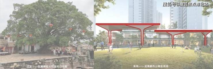 建筑造型提取传统村落的榕树意向,打造东莞首个大型树形标识建筑,形成“树下“灰空间+广场,方便市民开展多种社交活动增加城市活力,建筑造型“树”与基地旁边公园的树木相互映衬,结合错落有致的立体绿化,成为未来龙湾都市公园生活场。