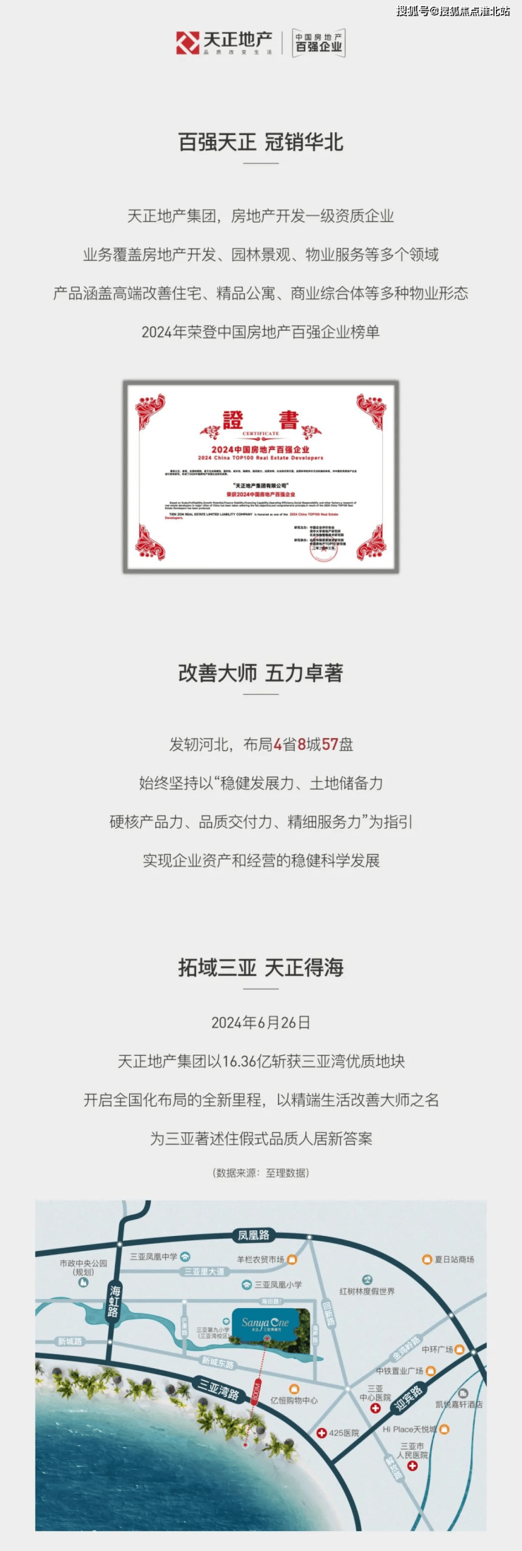 2024 年,天正地产凭借卓越实力荣登中国房地产百强企业榜单,以稳健发展力、土地储备力、硬核产品力、品质交付力和精细服务力为指引,稳健布局 4 省 8 城 57 盘,不断书写辉煌篇章。
