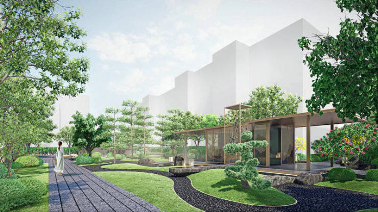 园林景观:由山水比德公司主笔设计,汲取新东方极简文化精华,打造私密围合 “大隐于市” 的生活场景。