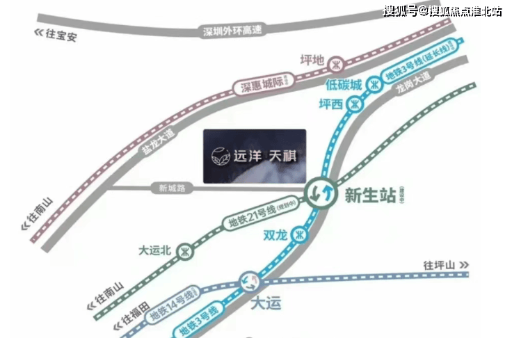 交通配套:直线约 500 米即享地铁 3 号线延长线与 21 号快速线双轨交汇的新生站。近邻深惠城轨的坪地站,途径前海、科技园等核心区域 11 座车站,通车后约 30 分钟畅达各区。此外,项目毗邻龙岗大道、盐龙大道等城市干道,约 40 分钟可抵达罗湖、福田各个片区。