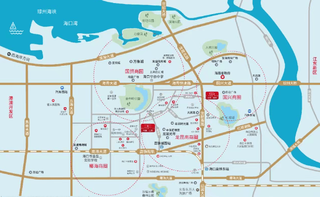 周边配套:交通方面,对接龙昆南路、南海大道两条城市主干道,周边有海口东站、快速路、轻轨城西站等,约 28 条公交线路。商业方面,坐拥约 80 万㎡海南首座 TOD 城市综合体龙湖商街、友谊南海城、新城吾悦广场等。