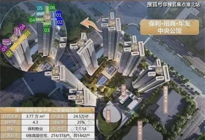 保利招商华发中央公馆采用了围合式设计,6栋47层高塔楼设计,小区自身配建有文化体育场馆和幼儿园,除了2#楼王是两梯四户,其余均为三梯六户。