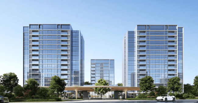 配套设施:主入口采用环岛式落客门庭,“超级树” 造型圆柱,搭配鎏金星空顶、黑色石材地面和水景雕塑,归家仪式感十足。