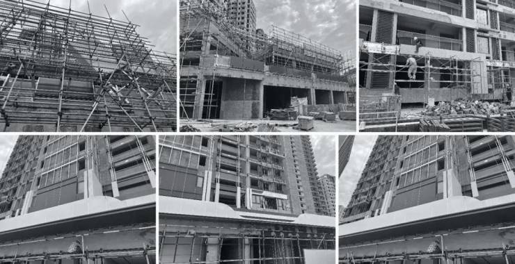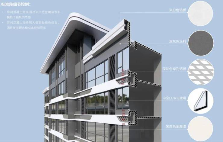 采用局部干挂幕墙和大面积真石漆的材料体系。米白色石材、铝板和真石漆的组合,辅以通透的玻璃材质,整体上形成虚实对比强烈的立面效果。为了实现设计的美学理念和成本控制要求,精心选用适当的建筑材料和技术手段。例如,采用具有良好塑性的混凝土材料和铝板,塑造复杂的曲线和轮廓,确保立面的结构完整性和美学忠实度。