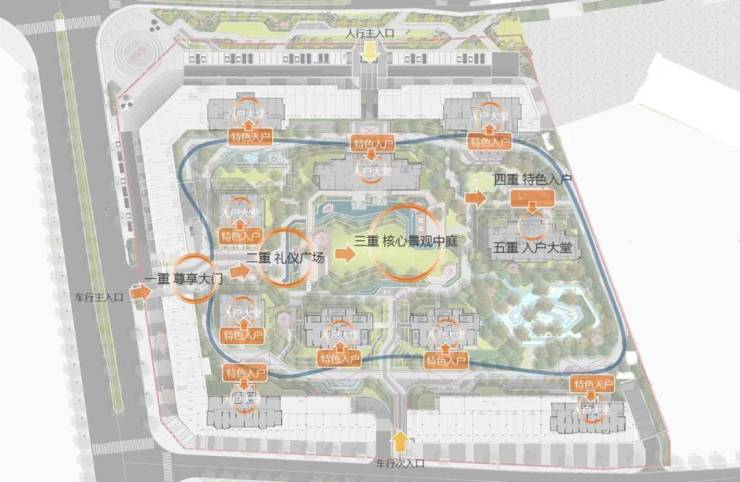规划结合传统多进院落的布局,设置多个庭院空间,每个庭院都有其独特的景观和功能,形成层次丰富的空间体验。空间和景观变化穿插形成四进的归家院落,院落的布局层层递进,为住户提供一种步步深入的体验,每一次转折、每一个景致都为住户带来不同的感受。