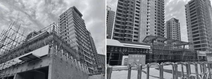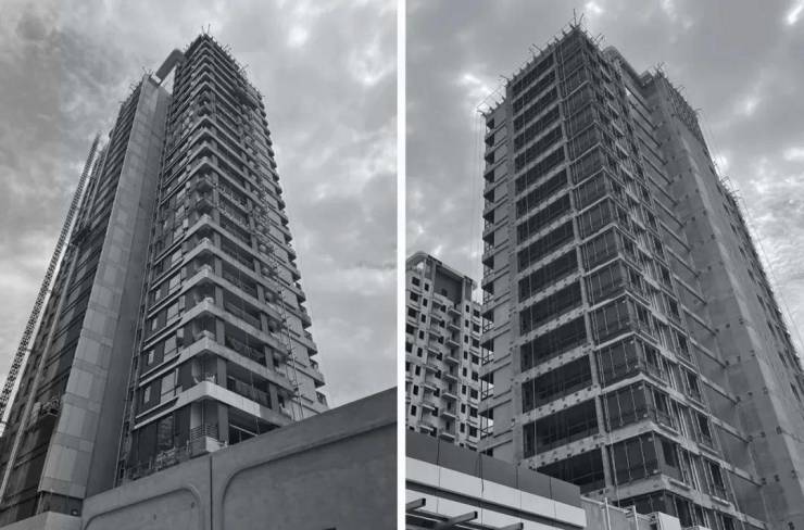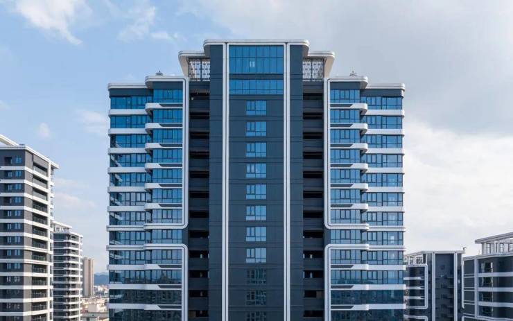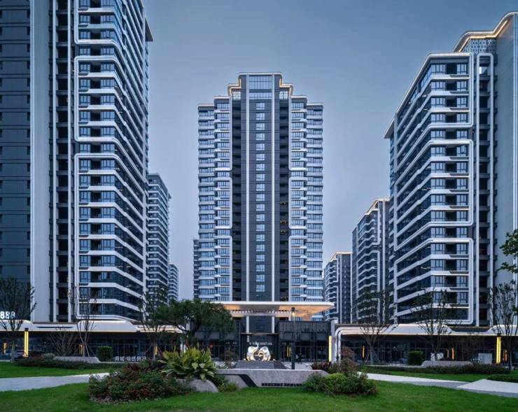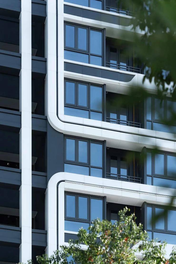 色彩上,黑白灰的素净反映了人与天地共沐清辉、意境悠然的生活态度。低奢的灰色铺陈于整个基底空间,呈现低调内敛的质感。刚柔并济的白色层间线条勾勒出典雅的建筑形体,让立面更显层次感与细节韵味。两者之间形成丰满的色彩对比和节奏变化。