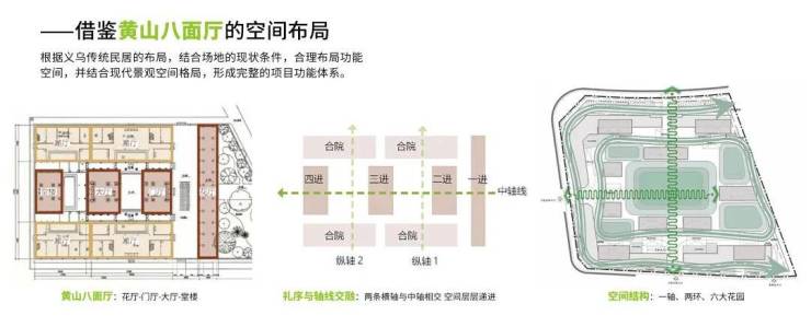 规划布局借鉴了当地传统民居黄山八面厅的空间布局,设置明确的中轴线,确保整体空间布局的对称性。中轴线不仅增强了空间层次感,还突显出传统与现代相结合的礼序感。传统的人居礼序通过现代的设计手法和布局,更符合现代人的审美和生活需求,同时也保留了其深厚的文化底蕴。