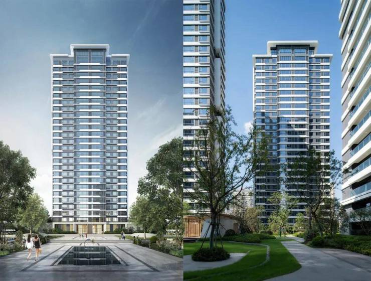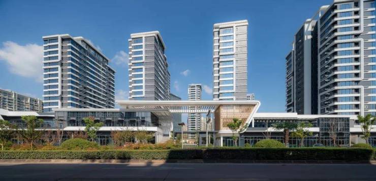 材料上,大面积玻璃的运用淡化了建筑与自然的界限,营造与自然融合、轻松悠闲的生活氛围。公建化的立面表情,去除复杂的装饰构件与线脚,将经典秩序与现代气质在立面上完美统一。