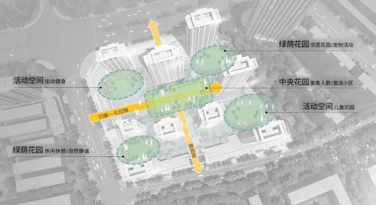 景观设计延续精铸、品质、简约的设计风格。以“现代雅境,八面佛堂生活厅”为理念打造一个现代与传统相融,高雅与奢华并存,功能与意境结合的理想社区。空间结构上,以“尊礼入口+四大主题空间”为设计亮点,中心花园串联两个入口空间。实现家在城市中,家中有公园的生活理想,为城市核心创造一个生态住区、艺术休闲住区和健康乐活的人文社区。