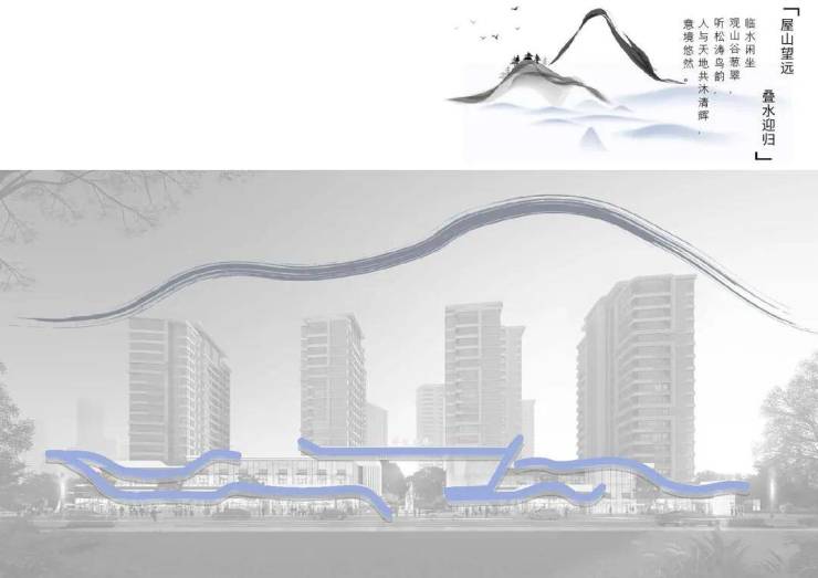 设计深入挖掘义乌在地文化的精髓,选取其山水意境和从容的生活态度作为设计灵感。立面以“屋山望远、叠水迎归”为设计理念。
