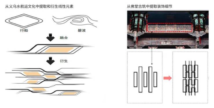 细部上,从义乌航运文化和佛堂古建中提取设计元素,运用金属回字纹点缀了关键部位,增加了建筑立面的精致感与可阅性。