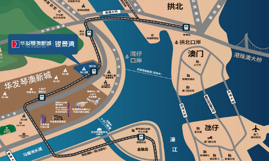 项目位于珠海湾仔片区,紧邻港珠澳大桥落脚点,与澳门、横琴金融岛隔江相望,是全国唯一与港澳路桥相连的城市区域,交通便利,可快速通达澳门、香港及珠海各主要区域。
