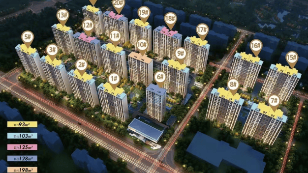 户型介绍:主力户型有建面约 93㎡的 3 室 2 厅 1 卫、103㎡的 3 室 2 厅 2 卫、128㎡的 4 室 2 厅 2 卫和 198㎡的 4 室 2 厅 3 卫。户型设计方正,强调南北通透、全明户型,如 93㎡户型南北通透、明厨明卫;103㎡户型南向双卧,主卧独立卫浴。