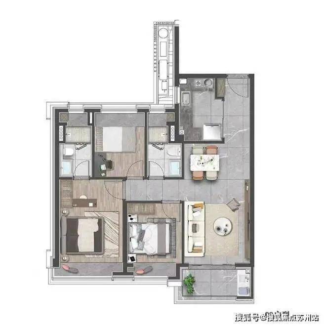 该户型贴合当代人居生活习惯,既适合三口之家小太阳家庭,也可以是三代同堂,每个人都能拥有独立空间。