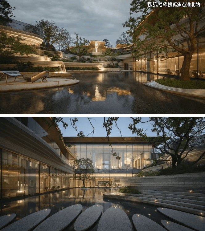 会所设施:约 1000㎡观瀑会所环绕浮岛森林展开,涵盖健身空间、瑜伽室、恒温泳池等多功能空间,通过大面积玻璃窗,实现与室外下沉庭院的无界交融。