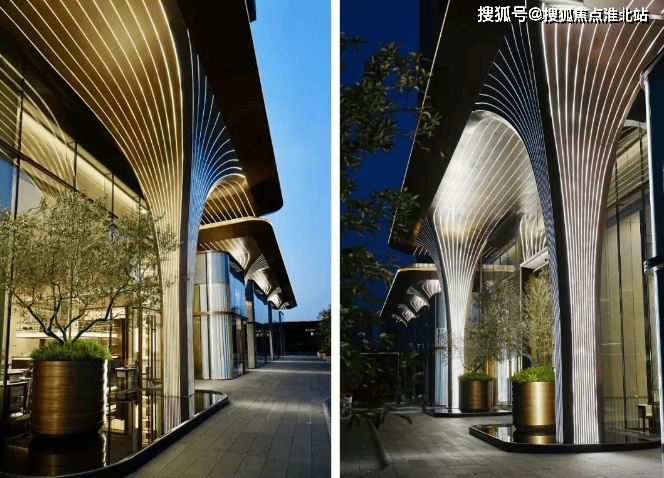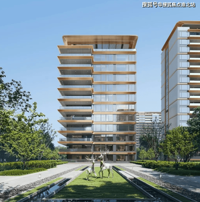 建筑设计:外立面采用大面积蓝灰色钻感玻璃幕墙 + 弧线形古铜色铝板,住宅基座部分采用木纹洞石,塔冠结合礼制概念元素,南北全封窗交付,挑檐 9 米的门头及酒店式环岛落客区、迎宾曲面水景叠瀑等,构建起归家的豪门仪式感。