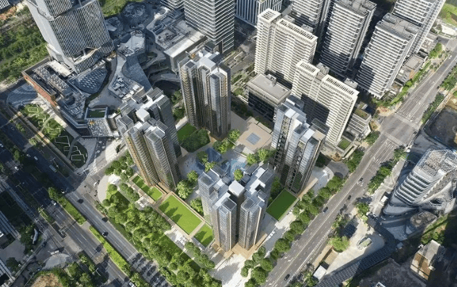 社区规划:采用蝶形楼体设计,外立面灵感来源于水纹。以东南亚风情打造园林,配置泳池、慢跑道等设施,首层架空拓展绿化面积,引入水系贯穿社区,架空层设健身区、成长乐园等泛主题会所,满足全年龄段休闲需求。