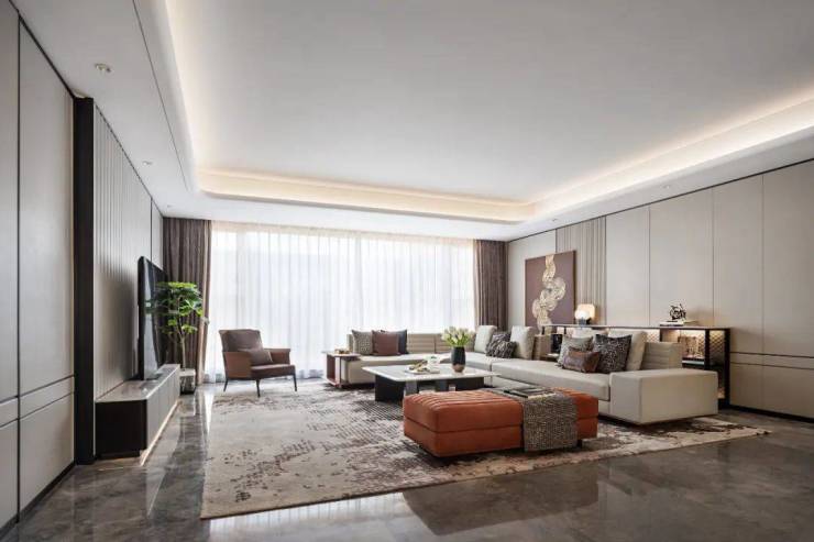 客厅在阔绰空间布局的背景基调上,软装设计将阳光、景观等自然元素无痕地穿插在生活区内,与精心打造的奢华室内装饰融为一体,给人带来温暖的触感,更营造了平和、宁静氛围。