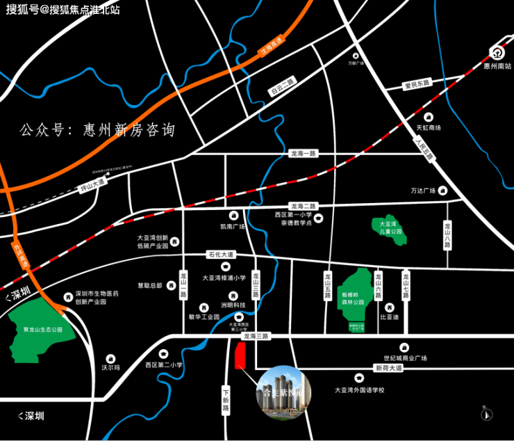 距离坪山约3.5公里,位于深圳向东发展的第一梯队,承接粤港澳大湾区、深圳1.4万亿东进红利,坐拥坪山高新产业区、大亚湾高新产业区双千亿产业,目前项目周边2公里范围内已落户慧聪总部、洲明科技等百亿级项目,未来人才集聚,有极大的发展空间。