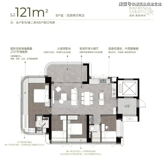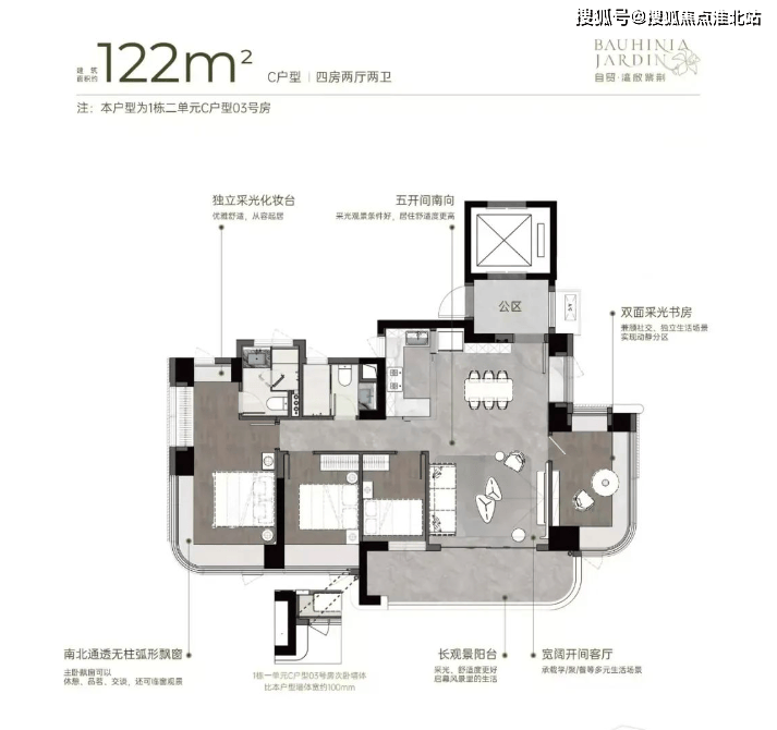121㎡四房两厅两卫:横厅南北通透格局,客餐厅 7.15 米开间,LDKB 一体化设计。