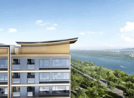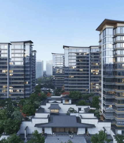 建筑设计:采用三面铝板 + 玻璃幕墙的新中式风格外立面,以香槟金为基调,顶部楼宇飞檐设计致敬南宋建筑美学。