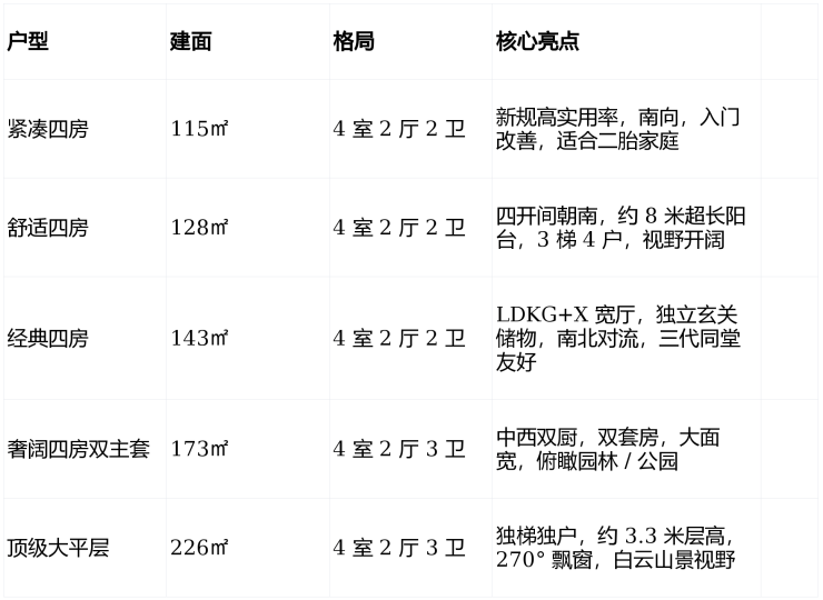 开发 / 物业 / 产权 / 交付:央企中建三局 + 白云城发联合开发;物业为中海物业(国家一级资质),物业费5.6 元 /㎡/ 月;70 年住宅产权;期房,预计 2027 年 12 月精装交付(华为鸿蒙智能精装标准,含中央空调、新风);首开组团 5 栋 42–45 层超高层,配建 9 班公办幼儿园,西侧为华中师大白云九年制公办学校(2026 年开学)。