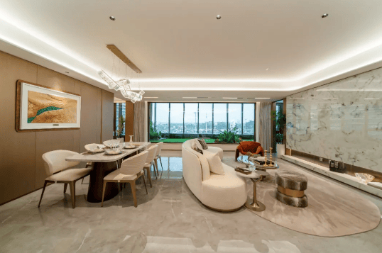 公区尺度开阔,LDKB一体化设计(客餐厅厨阳台一体化),采光通风俱佳,空间通透感强。