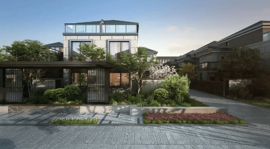 新中式建筑风格:采用新中式格调,以黑色面瓦为黛顶,整体线条简洁明快,建筑布局延续上海地域文化,营造出清幽的社区氛围。